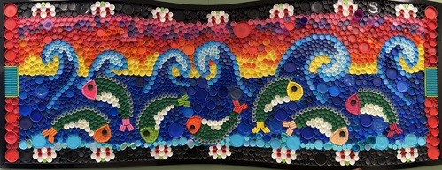 To commemorate the successful unification, members and artists, Laura and Arnold Reichert, created an 11-foot-long, 4-foot-wide mural made of plastic bottle caps of varied sizes and colors. Images seen in the mural are symbolic with water being the main theme as in reformed tradition water is a life-giving force and as the waters of Baptism. The seven fish represent the seven historical churches and their faithful saints from the east Birmingham area that over time formed CSPC. The white abstract flowers in the border represent the unique Cahaba Lily which is only seen in this part of the country. A picture of the mural is shown above.