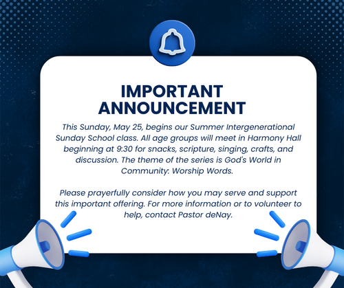 Hello, Cahaba Springs members, friends, and visitors. Join us Sunday, May 25th at 11 for worship in person or at home on YouTube or FaceBook. We are led by Liturgist Lynda McLean and Pastor deNay Kirkpatrick Click to see our readings from