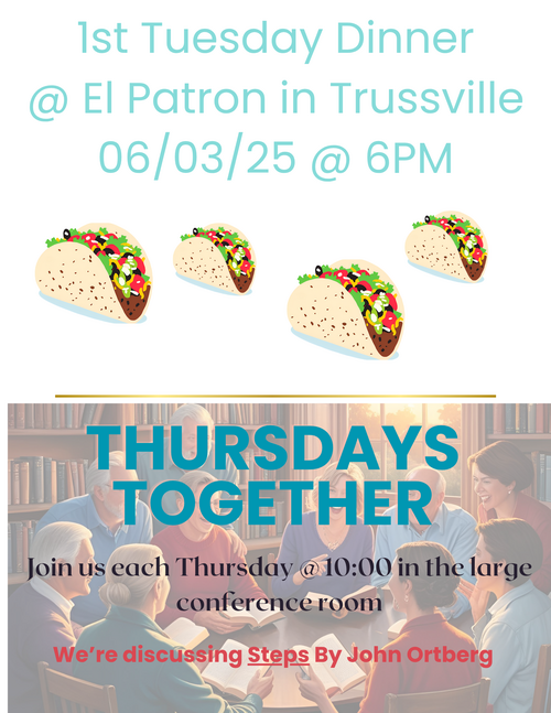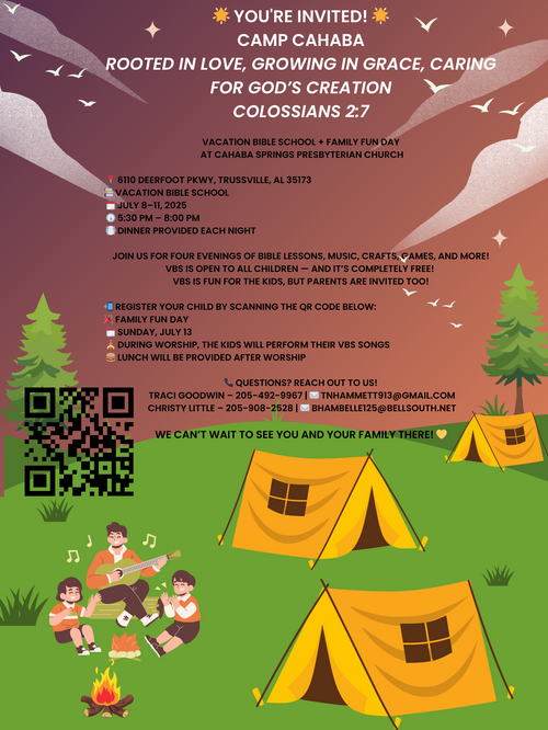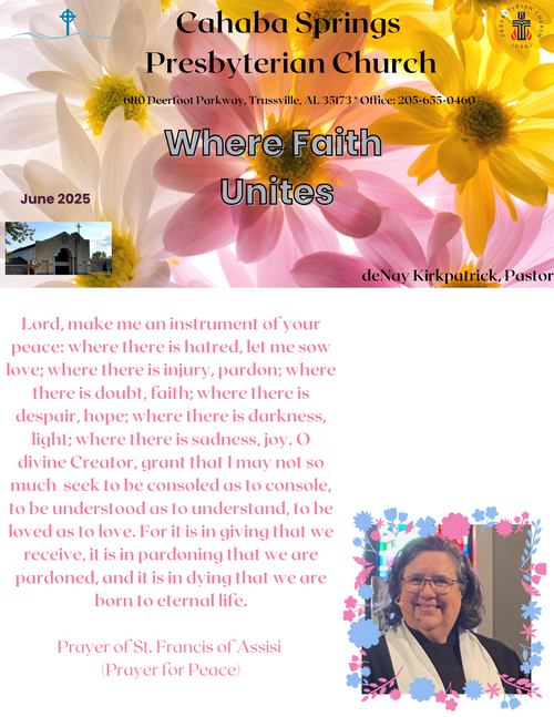 Hello, Cahaba Springs members, friends, and visitors. Join us Sunday, June 1st at 11 for worship in person or at home on YouTube or FaceBook. We are led by Liturgist Jennifer Smith and Pastor deNay Kirkpatrick Click to see our readings from